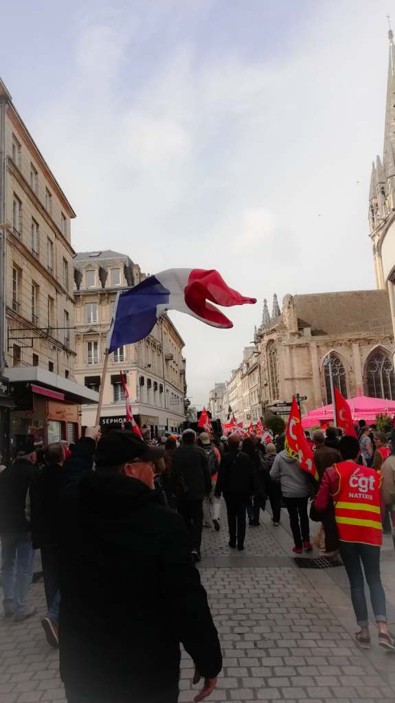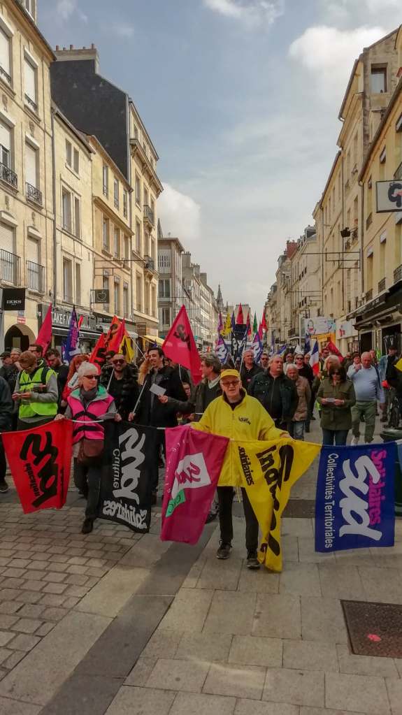 Une journée de mobilisation à Caen qui solidarise les syndicats présents CGT, SUD, FO, Solidaires, FSU, et les gilets jaunes, tous très nombreux, dans une marche pacifique.