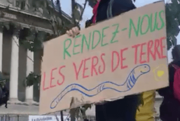Un plastique qui s’inflitre dans la terre et des pancartes au solgan contre les pesticides « Rendez-nous les vers de terre«