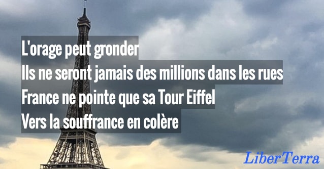 Cette France tenant l’épée du pleuple, la brandissant haute et faisant naître la République. Elle ne savait pas cette révolution de misère qu’elle serait vendue au commerce, à l’antique pouvoir, aux Césars chacun à leur temps, répétant la même cruauté.