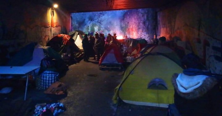 « Dans le parc du Musée de la Mine à Saint-Etienne vivent depuis plusieurs mois 7 familles d’origine roumaine, dont environ 25 enfants. Elles s’abritent tant bien que mal sous le pont de la voie ferrée et ont installées là un campement de fortune fait de tentes et de palettes.