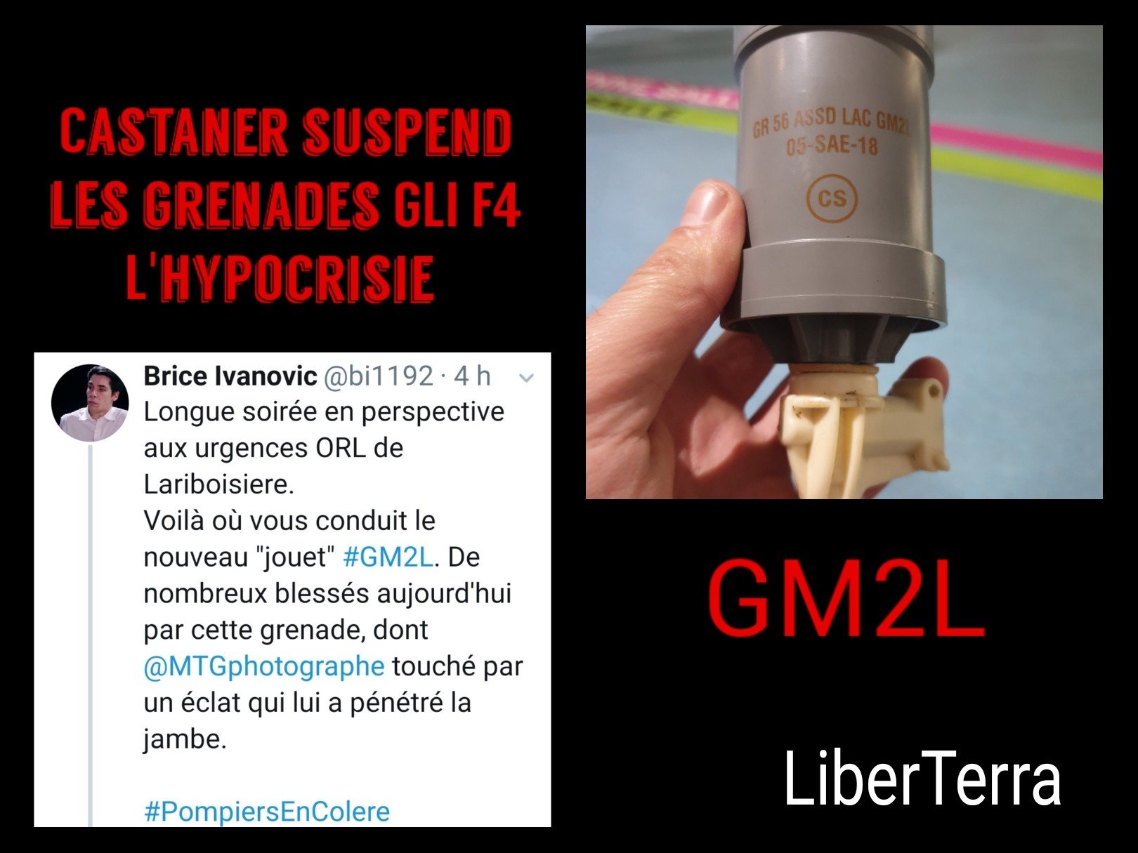 Christophe Castaner qui a suspendu les grenades GLI F4 dimanche dernier, suite à la brillante plaidoirie d’un élève avocat Fabien Bourdon, « Cette arme qui déshonore la République» lors du concours de plaidoiries des droits de l’homme. Mais le gouvernement en ce dimanche 26 janvier ne faisait qu’un coup d’annonce car le remplacement de la grenade GLI F4 était déjà prévue par la grenade GM2L qui fait partie des stocks disponibles. Laquelle était utilisée lors de la manifestation des pompiers en ce 28 janvier.