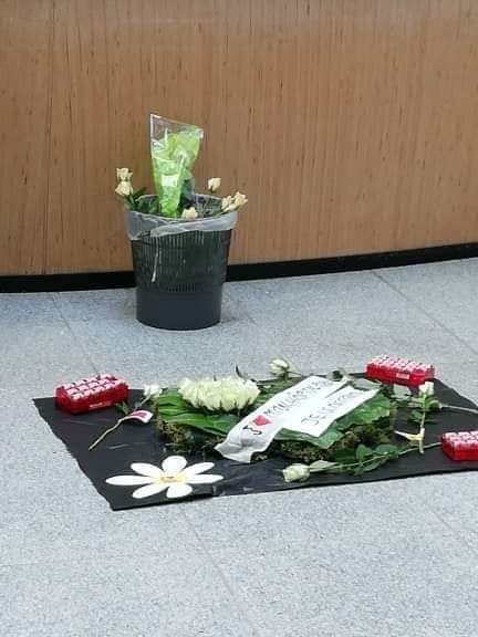 Un cercueil, des roses blanches sont déposées pour accompagner le message fort envoyé à Agnès Buzyn, au pouvoir dominant, à la technocratie, et également à chacun de nous car le coeur de l’hôpital, c’est le nôtre.
