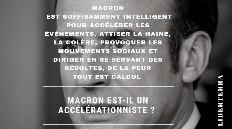 Le bouleversement fait preuve d’une accélération étonnante. Il précipite avant que nous ayons le temps de nous préparer à un évènement et ceux-ci s’inscrivent dans un mouvement rapide, dans une succession d’étapes. Emmanuel Macron correspondrait à cette conception du chaos qui précipite et dirige cette cadence qui provoque des évènements forts, qui transforment durablement, profondément notre civilisation.