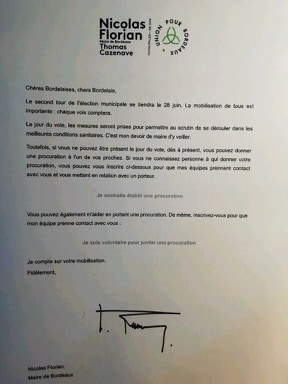 Il est sous l’intitulé Nicolas Florian , maire de Bordeaux, Thomas Cazenave, avec le logo de « Union pour Bordeaux » et en petit , la mention « Municipales – 28 juin » indiqué que « les mesures seront prises pour permettre au scrutin de se dérouler dans les meilleures conditions sanitaires. C’est mon devoir de maire d’y veiller » y déclare Nicolas Florian qui signe ce mail . Puis , il est précisé qu’il est la possibilité de « donner votre procuration », « si vous ne pouvez être présent le jour du vote » et qu’il est donc dans ce cas de pouvoir « vous inscrire ci-dessous pour que mes équipes prennent contact avec vous et vous mettent en relation avec un porteur » À la suite de cela, il est un encadré avec la mention « Je souhaite établir une procuration » et c’est là que la problématique est soulevée car ce lien aboutit à une fiche de renseignements à remplir et figure un encadré mentionnant « j’ai besoin d’une procuration pour Nicolas Florian le 28 juin ».