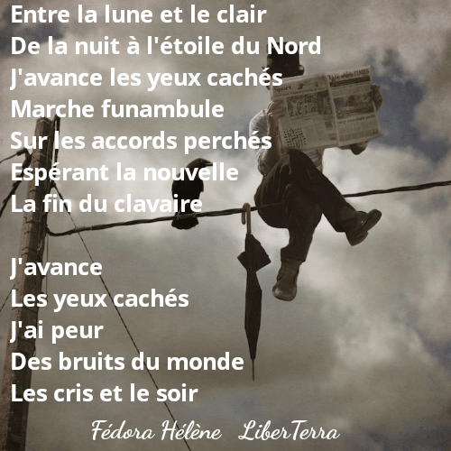 Po aime en LiberTé Les cris et le soir J'ai mis un chapeau noir Tombant sur mes yeux Dans le noir, j'avance À demi-cachée Entre la lune et le clair De la nuit à l'étoile du Nord J'avance les yeux cachés Marche funambule Sur les accords perchés Espérant la nouvelle La fin du clavaire Assise en hauteur Sur le fil métallique Suspendue à l'abri Du bruit du monde J'ai peur Les cris et le soir Tes colères noires Tout en noirceur Résonnait ta haine Sur une colombe Pleurant tout l'amour De son corps épuisé Sous ta violence Papa J'avance Les yeux cachés J'ai peur Des bruits du monde Les cris et le soir L'homme n'est pas l'ange Gardien d'une petite fille Entre deux portes et tremblent Les murs de ma chambre Le cauchemar fermé à clé Son alcool et hurlements de loup Il récitait la mort En poésie au pied du berceau C'est triste l'histoire Papa Tu ne fais pas rêver La poupée que tu voulais Brûler , déchirer Ton ombre monte l'escalier Le soir, les cris J'ai peur J'avance Les yeux cachés J'ai peur Des bruits du monde Les cris et le soir Seule Je jette des sos en mer La police dit, il est « chez lui » La justice abandonne Est ce cauchemar Après les traces de rage D'un père qui fracasse Les carreaux de verre Le soleil n'entre pas Les rayons se figent Sur le verre brisé Papa Casse la vie Les portes fermées à clé L'espérance s'abrite Dans le cœur d'un enfant Une colombe à Terre Si douce si calme Ne bouge plus Fragile, tremble Il la balance, la lance Contre les murs de sa haine Une colombe, une délivrance La justice, c'est elle Qui chaque jour porte la vérité Plus haut que toutes les flammes Une femme Elle console toutes les peines Son amour plus fort que tout Délivre, accueille le paradis Au milieu de l'enfer Un homme viole l'innocence Assassine l'aurore Je voudrais un jour Que s'éveille l'instant La chance de la vie De la liberté Du bleu du ciel Ouvrir les yeux sans crainte Sauver un enfant, une femme D'un homme abattant la violence Sur les espoirs des innocents J'avance Les yeux cachés J'ai peur Des bruits du monde Les cris et le soir ©Fédora Hélène