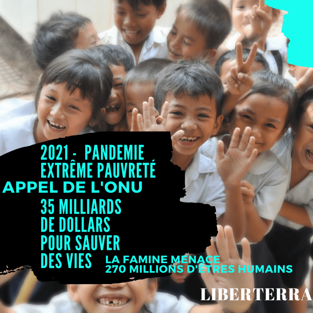 Le 1 décembre 2020, le rapport « Global Humanitarian Overview » de l’ONU indique que 2021 sera l’année d’une pandémie d’extrême pauvreté entraînant un risque très important de famine aiguë pour 235 millions d’êtres humains en grande vulnérabilité et confrontés aux conflits, déplacements, à l’urgence climatique, la faim et à la pandémie de Covid19, ainsi que souffrant des épidémies évitables comme celle de la rougeole ou du choléra.