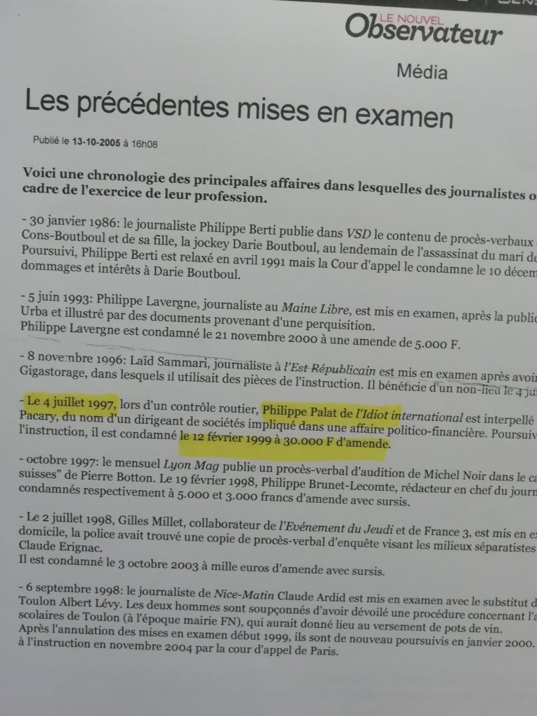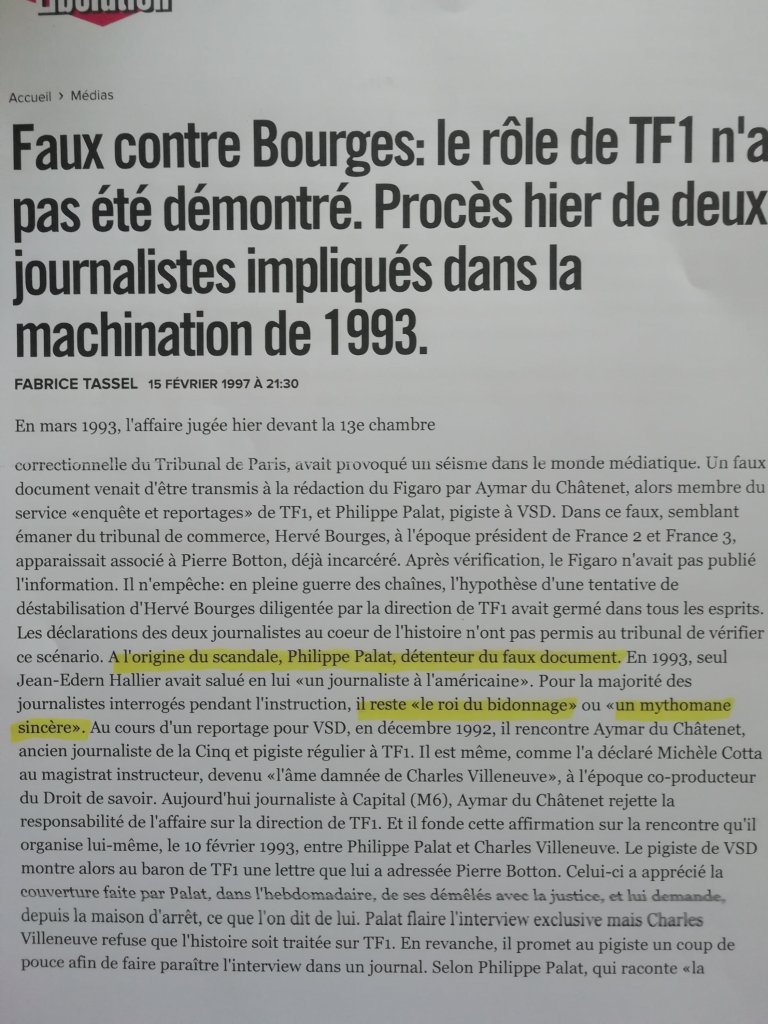 C’est cet escroc et faussaire multirécidiviste , le prince décharmant, qui aura son nom cité dans la presse dans des articles concernant ses multiples escroqueries , ainsi que pour les faux et usage de faux qu’il fait, comme il y aura son nom cité et sa photo apparaissant au JT lors de l’affaire TF1- Philippe Palat fabrique un faux diffamant alors Hervé Bourges. Philippe Palat qui en grand manipulateur piège un jeune journaliste qu’il n’hésite pas à vouloir faire condamner. Le décharmant est le seul et unique coupable et se sert des gens comme de ses choses.
