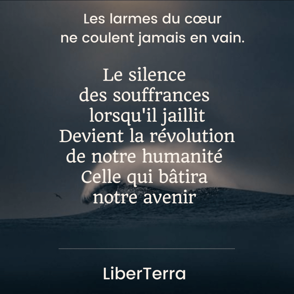 Puis, nous devons penser à nos enfants qui ne peuvent dire et faire librement et qui attendent de nous que nous les respections en leur offrant un avenir serein où ils pourront respirer librement, boire aux sources propres en veines de notre Terre comme elles courent dans notre corps. Notre corps est cette cartographie de la Terre. Nous pouvons lire en nous la nature, ces chênes vénérables, ces animaux merveilleux, cette lumière rendant vivant l’univers. Nous sommes cette expression de la vie, cette osmose des éléments du vivant, ces mots essayant de retracer notre origine, celle émanant de l’immensité de la liberté que nous portons pour vivre, mais que nous ne pouvons atteindre et égaler. Cette plénitude qui nous habite quand nous aimons, cet amour qui nous traverse et nous sauve, nous donne vie, c’est cela le verbe aimer.
