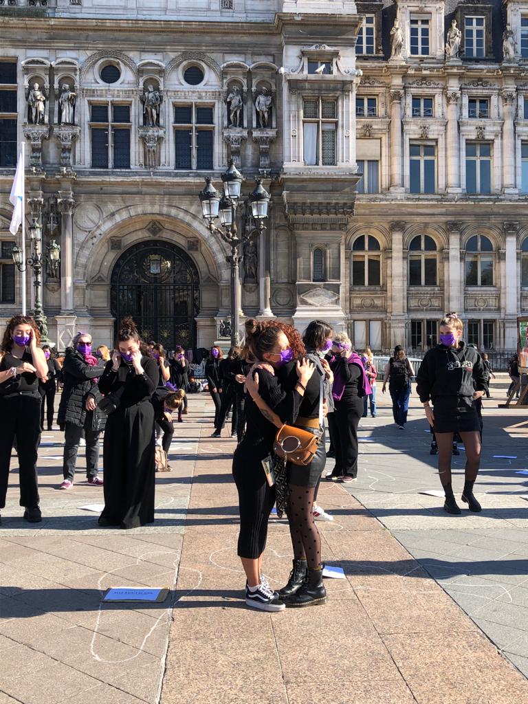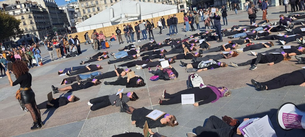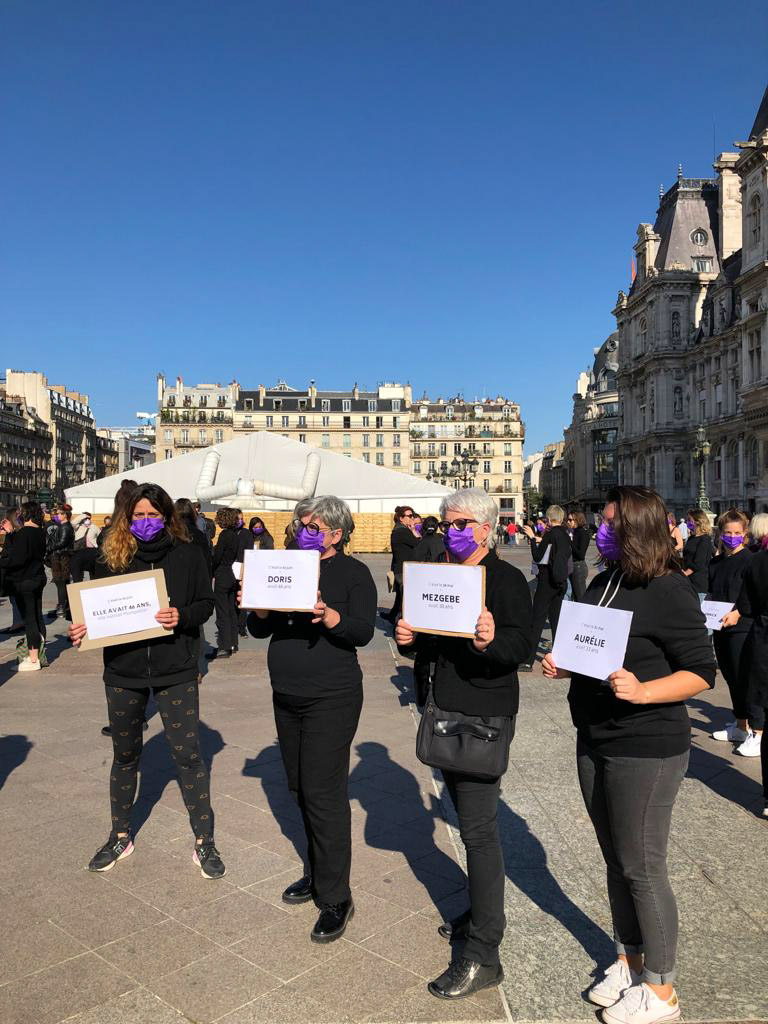Un « die-in » s’est imposé samedi 16 octobre après-midi sur la place de l’Hôtel de ville de Paris à l’initiative du collectif féministe Nous Toutes. Des femmes, des silhouettes dessinées à la craie sur le sol, puis ces femmes de noir vêtu, un masque violet sur le visage tenant chacune une feuille blanche sur laquelle s’inscrit le prénom d’une femme tuée par celui à qui elle avait donné tant de confiance, de générosité, tant d’humanité, tant de vie. Ces femmes assassinées par leur conjoint ou ex-conjoint.