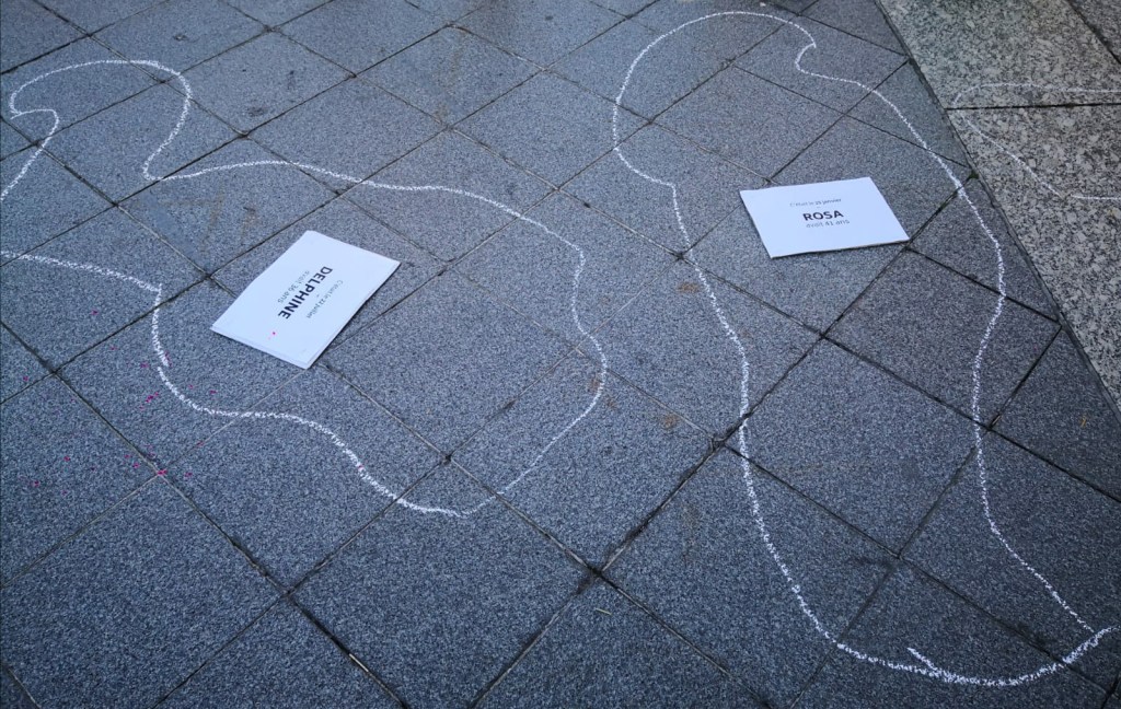 Les militantes se relèvent, elles sont celles debout, comme l’ont été les femmes parties à jamais tuées si lâchement, si horriblement, elles si belles de vie. Les militantes lancent des SOS en lumière, les slogans : « Silence, ils nous tuent », « Pas une de plus ». Et, il sera observé une minute de silence en femmage aux victimes de féminicides et à leurs enfants. Une très belle action laissant paraître une grande émotion dans les rangs des militantes, cette joie d’être ce rassemblement fort, et la peine ressentie – les féminicides, ces vies parties quand il était leur droit de vivre.
