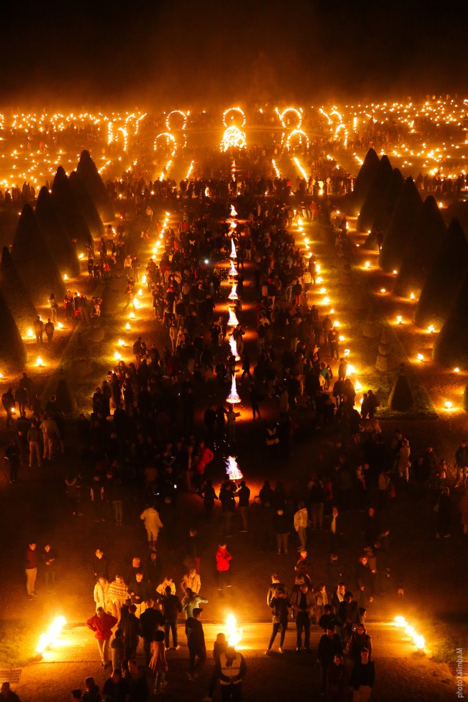 Les sculptures de feu, musiciens, puis un peintre extraordinaire dessine sous nos yeux éblouis, la toile exposée. Des scènes de funambules sans fil, au théâtre de la rue, les jeux et personnages apparaissent, se transforment, disparaissent pendant que dans le parc du château s’expose des tableaux aux visages du monde, ce sourire s’unissant aux autres. Les contours et les couleurs se révèlent à la lumière des bougies et la cire s’écoule doucement faisant du dessin le vivant.