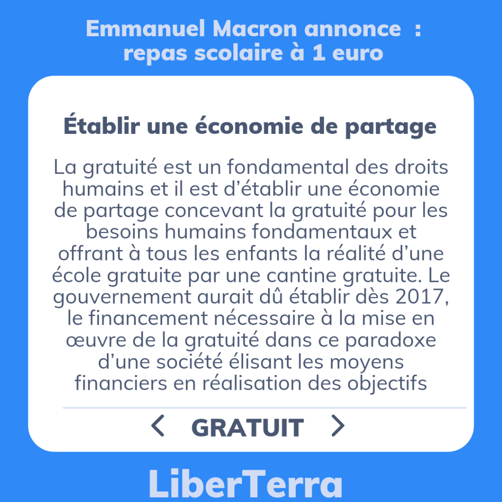 La gratuité est un fondamental des droits humains et il est d’établir une économie de partage concevant la gratuité pour les besoins humains fondamentaux et offrant à tous les enfants la réalité d’une école gratuite par une cantine gratuite. Le gouvernement aurait dû établir dès 2017, le financement nécessaire à la mise en œuvre de la gratuité dans ce paradoxe d’une société élisant les moyens financiers en réalisation des objectifs.