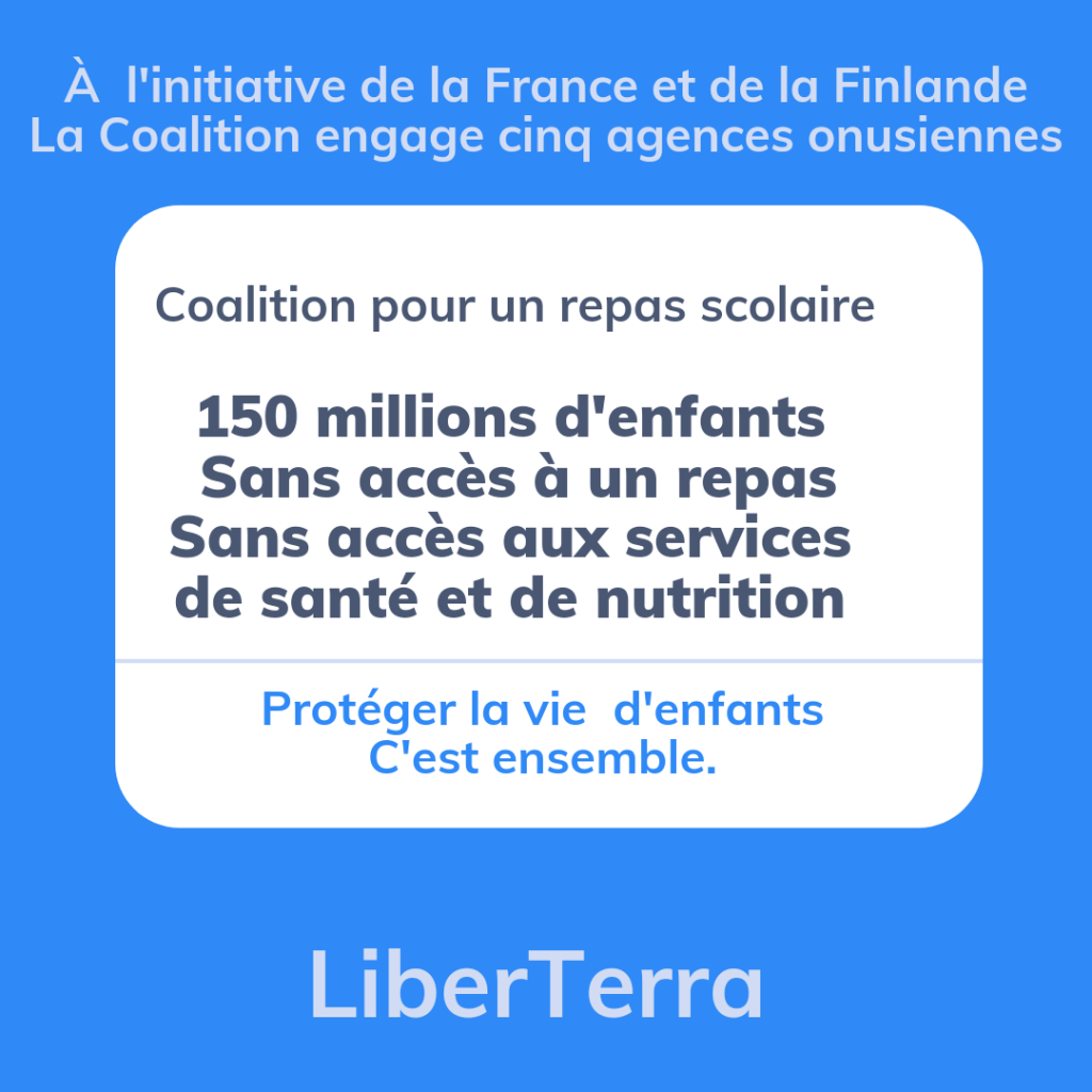 L’Organisation des Nations Unis pour l’alimentation et l’agriculture (FAO), l’Organisation des Nations Unis pour l’éducation, la science et la culture, UNESCO, UNICEF, le Programme alimentaire mondial (PAM) et l’Organisation mondiale pour la santé, (OMS), s’engagent à apporter leur expertise à la Coalition – une initiative dirigée par la France et la Finlande et qui regroupe 60 pays dont l’objectif est que chaque enfant pauvre puisse recevoir un repas nutritif à l’école d’ici 2030.