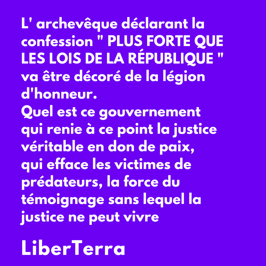L’archevêque déclarant la confession « Plus forte que les lois de la République » va être décoré de la légion d’honneur. Quel est ce gouvernement qui renie à ce point la justice véritable en don de paix, qui efface les victimes de prédateurs, la force du témoignage sans lequel la justice ne peut vivre.
