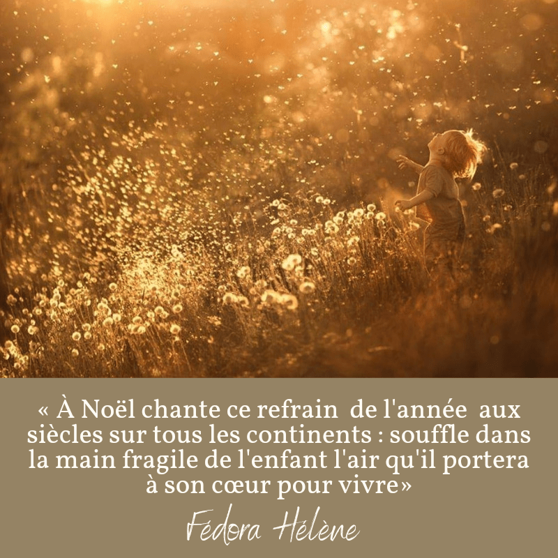J’ai grandi dans les plaines, les vallées et les collines. La biche sensible fuyant au moindre bruit. Je me suis fait silence pour mieux la contempler. C’est ainsi que je suis devenue cet air blanc au-dessus de l’enfant, lui contant les secrets pour qu’il ne s’évanouisse au froid de l’hiver et son corps tremblant. N’aie pas peur, ils verront la si jolie paix te couvrir des ailes en flocons la colombe. À Noël chante ce refrain de l’année aux siècles sur tous les continents : souffle dans la main fragile de l’enfant l’air qu’il portera à son cœur pour vivre.