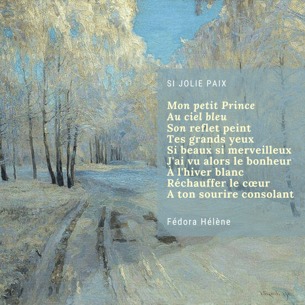 Je regarde par la fenêtre l’étoile au soir, je sais que les longs bois sombres demeurent, qu’ils nous rappellent que nous devons conquérir la fin des drames. Cette fin que l’on ne peut encore écrire. Je dessine alors le petit Prince, pas le conte à la rose, mais l’enfant véritable aux grands yeux bleus, au souffle clair, au cœur fragile, celui que je serre contre mon cœur. Cet amour vivant, la neige se fait de diamant et si j’ai parcouru la Terre des larmes, si j’ai eu la force d’y survivre, j’aurais celle de couvrir les hivers blancs de paix. La goutte d’eau tombant sur mon front venant d’elle et d’aucune autre pluie pour la signer de ma main sur la page de la vie.
