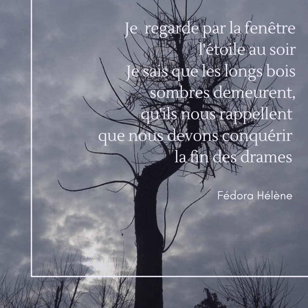 Je vois cet enfant couché dans la neige, son corps posé au milieu du chemin. Je regarde du haut de la branche des immenses peupliers, sa maison et les lumières éteintes. Ce village de jadis et les pas effacés. Les jeux et les rires des enfants courant entre les allées et les jardins. Le silence s’éprend du temps et ne le quitte plus. Les siècles défilent, le vent passe d’une terre à une autre, et mon corps au froid se brise, quand doucement l’amour me rappelle la si jolie paix qui me contait quand je m’en allais vers le grand bois, la fin que je voulais écrire pour donner au bonheur tout le commencement.