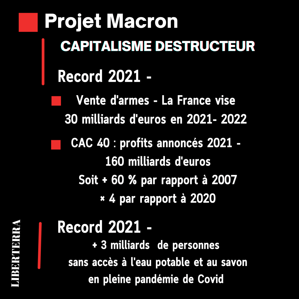 Emmanuel Macron pose une estimation de 30 milliards d’euros de profits par les ventes d’armes de 2021 à 2022. Nous sommes dans une logique de guerre qui par la pandémie de Covid a posé ses marques. Un enrichissement des milliardaires et simultanément, une augmentation de la pauvreté, une aggravation des violences aux personnes, aux femmes.