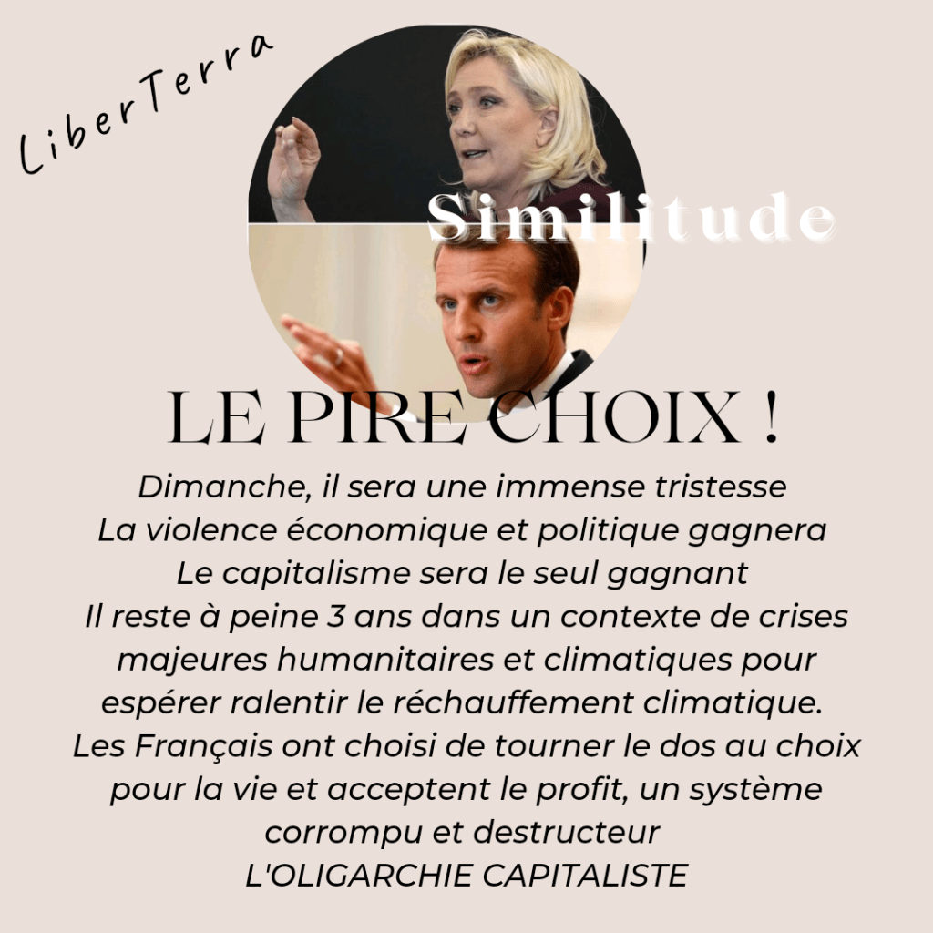 Puis, au loin, la mascarade des élections est à son théâtre entre les bulletins blancs et les abstentions, les votes contre Marine Le Pen, Emmanuel Macron, le président mal élu va être dans la poursuite d’un capitalisme destructeur.