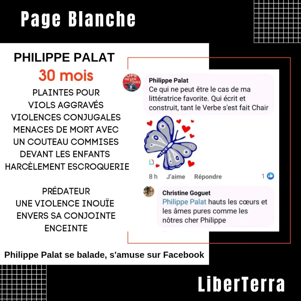Philippe Palat qui dans son extrême méchanceté écrit « Le Verbe c’est fait chair« , à la journaliste le flattant, au vide qui caractérise ses relations. Lui détruisant des grossesses. La religion lui servant à manipuler dans tout ce néant qu’il a choisi. Et, mettant ses majuscules comme toujours « Sublissisme » , dans ses flatteries vulgaires. Il a traumatisé et complètement abandonné ses enfants et il flatte des gens malveillants qui sont charmés par sa diatribe et qui effacent les victimes. Il a tellement de temps à perdre et l’impunité morbide pour trophée de son existence. Tous les jours , il se félicite d’être un prédateur. En France, il peut.