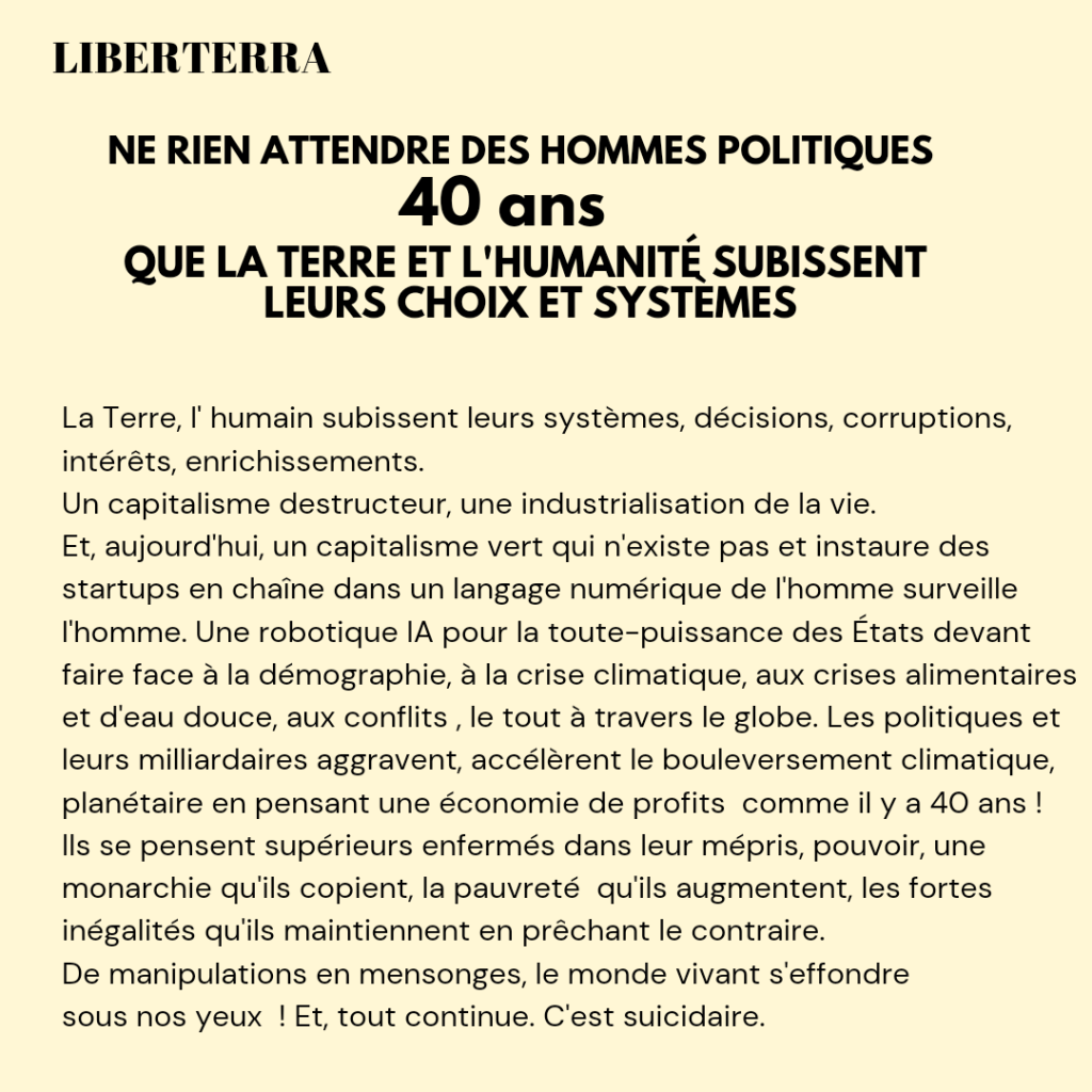 La liberté de vivre et non de posséder jusqu’à la folie de milliardaires enfermant notre humanité dans un déséquilibre constant faisant de l’humain, une valeur argent. Un verre d’eau devient lui-même un état de profits. Des puissants en Dieux, comme Bernard Arnault, devenant ces oppresseurs, devenant la réussite, alors qu’ils sont l’échec. L’échec qui donne à peine trois ans à notre humanité pour espérer ralentir le réchauffement climatique.