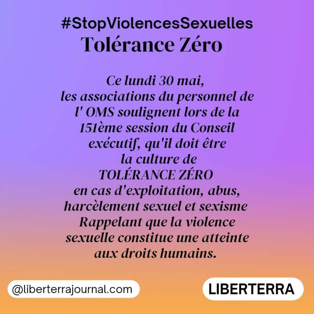 La 151ème session du Conseil exécutif de l’OMS se déroulant ce lundi 30 mai, a permis à la Présidente des associations du personnel de l’OMS, IARC, PAHO et UNAIDS, Daniella Salmon, d’exprimer la nécessité de lutter contre toute forme de violence au sein de travail, à savoir : renforcer la lutte contre les violences sexuelles et sexistes, contre les discriminations et le racisme au sein de l’OMS, et veiller au bien-être du personnel au sein de l’OMS, comme aux Nations Unies.