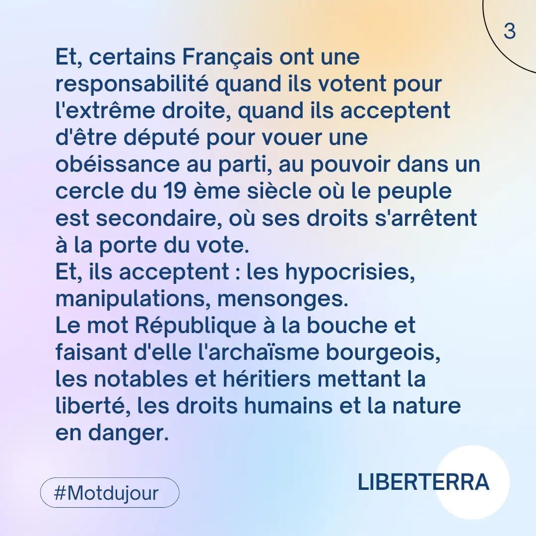 Une Assemblée nationale vouée aux politiques capitalistes, faisant de la vie un profit et fuyant les droits humains et de la nature. L’hypocrisie sera encore quand l’enjeu majeur face à une triple crise planétaire menaçant notre avenir se fait ce présent. Les droits humains s’éloignent de France et les réfugiés en peine quand ils ne sont pas ceux qui correspondent à un intérêt politique.