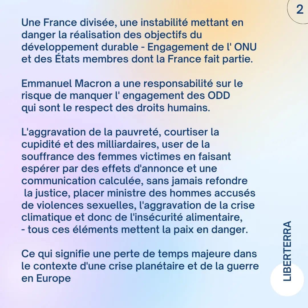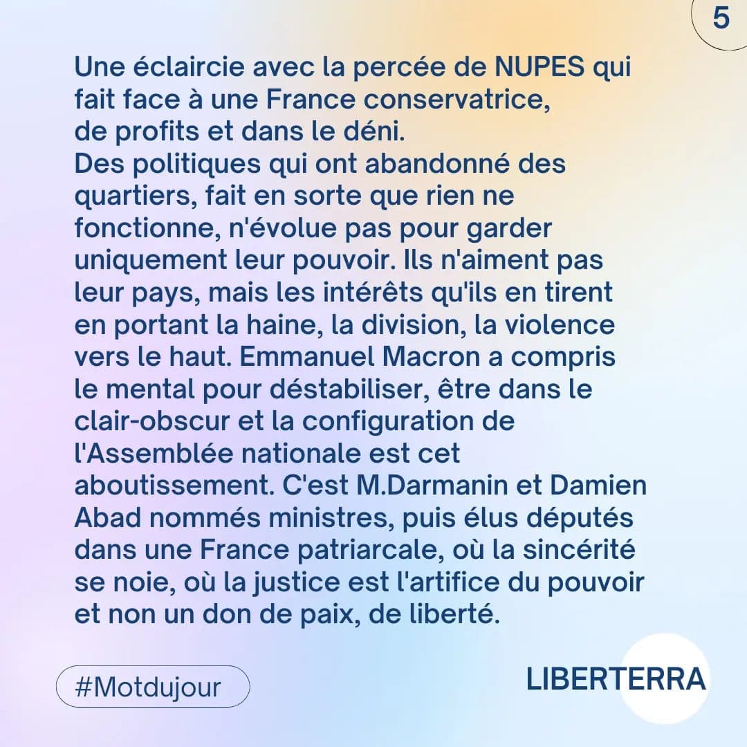 Il ne reste à Emmanuel Macron que l’économie sans avenir, que la paix maltraitée, que les droits humains affaiblis. Le silence étonnant face à l’augmentation dramatique des prix des produits alimentaires, des charges, de l’énergie et l’indifférence persistante, des députés Ensemble fêtant leur élection et passant aveugles devant la pauvreté. Un mal-être profond est en France, et le bien-être de tous demeure oublié. La haine domine, et tous continueront inlassablement