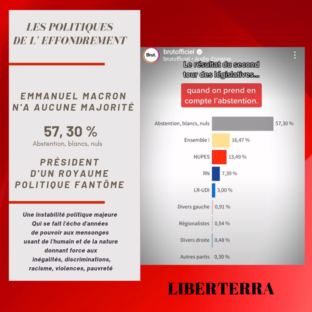 Marine Le Pen fait son entrée à l’Assemblée nationale avec son « gouvernement » constitué de 89 députés et se consacre à sa mission en annonçant quitter la présidence du RN. Emmanuel Macron triomphant lors du bédat des présidentiel, d’une élection mascarade où le suffrage universel vient lui aussi en résonnace de l’instable. Emmanuel Macron élu par les voix faisant barrage à l’extrême droite, se retrouve face aux blocages de politiques en jeux de dominos qui s’effondreront tour à tour. Un autre monde prend naissance à la source de la crise planétaire. Des langages possibles, il est celui de la survie sur une Terre assoifée. Les réformes se projettant au-delà de 50 ans ne sont que le mensonge politique, celui d’un monde déjà passé. Le déni, les politiques le cultivent. Comment ferait-il autrement pour continuer à être un pouvoir ? Ils prêchent tous des politiques d’hier quand le présent dessine un autre futur que celui de leur vision politique.
