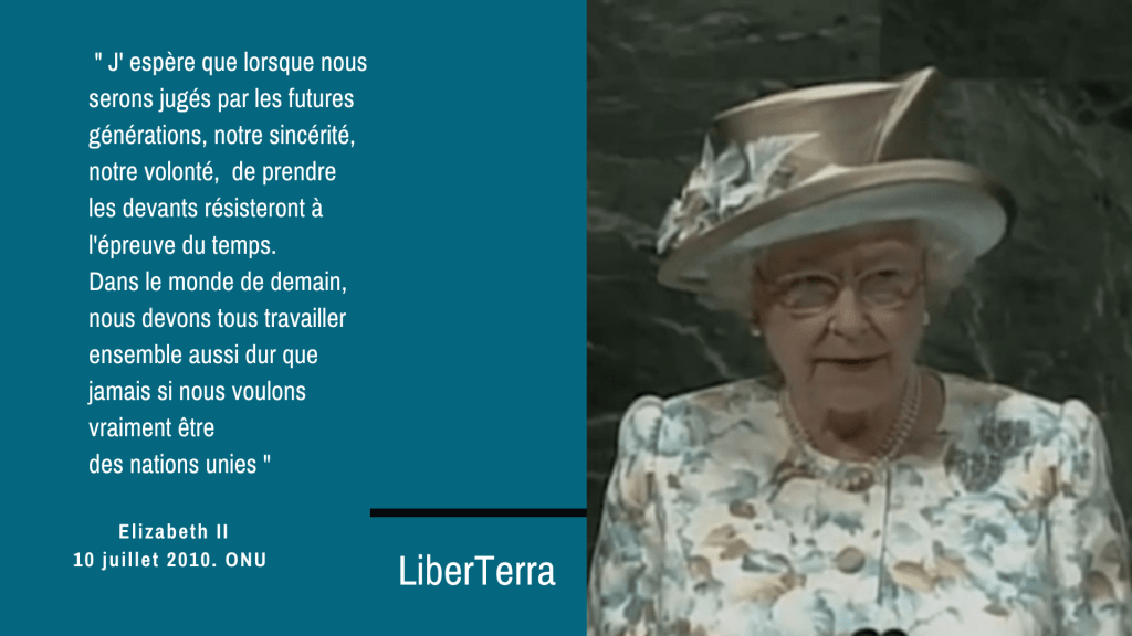 Elizabeth II – La confiance, le soutien à la résistance durant la seconde guerre mondiale, elle fut cette volonté de changer le monde en guerre en une île en paix. L’épreuve ayant forgé un règne, un devoir, sa mémoire reconnaissant que le monde se faisait de plus en plus difficile, se jettait dans un précipice toujours plus vaste, et son souhait était de travailler pour que les nations soient unies – cette volonté réalisée pas à pas par tous les artisans de paix à travers le monde, se trouve confronter à l’absolu danger, notre terre nourricière en détresse.