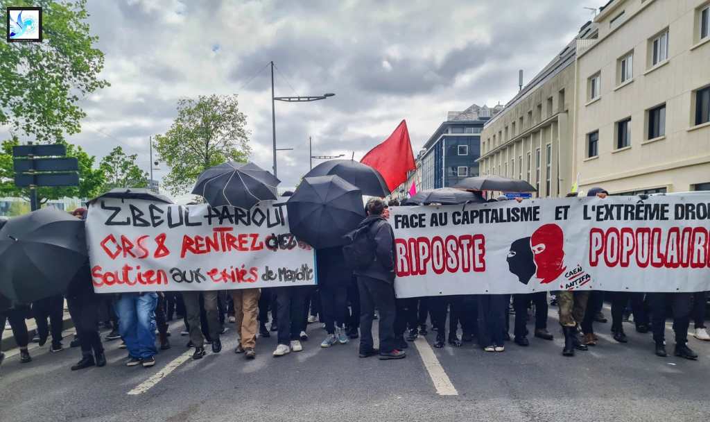 La foule forte de 40 000 personnes marche, investit les places et les rues de Caen. Des milliers de personnes défilent et passent devant l’Hôtel de la préfecture, la mairie, les entités du pouvoir bien isolées du peuple en ce 1er mai défilant fièrement.