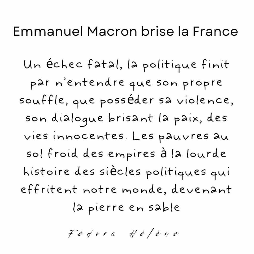 La fracture est entre Emmanuel Macron et la paix. Il a délaissé l’humain libre, considérant le peuple comme l’objet réalisant son projet, son ambition. Ce sont des politiques de violences, des acquis d’héritage, comme par les trahisons. La politique d’hier se veut l’avenir et les conséquences des décisions prises par Emmanuel Macron seront amplifiées dans une décennie, et ainsi de suite.