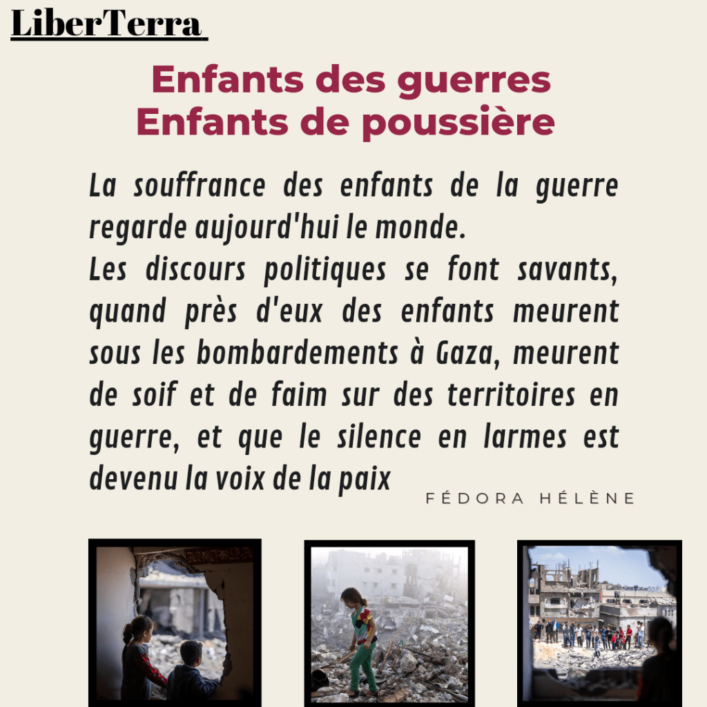 Les enfants de Gaza oubliés par la violence politique, des Chefs d’État allant d’une manipulation à une autre, d’un sujet à l’autre, et pensant tenir le monde entre leurs mains, les continents soumis aux choix politiques et les rivières disparaissent, les arbres abattus, le désert avançant vers nos cités de pierre, la liberté disparue.