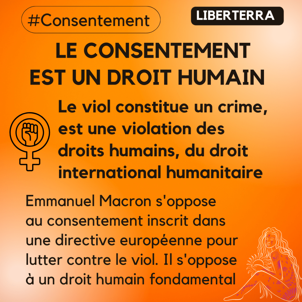 En refusant que soit inscrit le consentement dans une directive européenne pour lutter contre le viol, Emmanuel Macron s’oppose à un droit fondamental et il fait preuve d’une absence de conscience. Par ailleurs, des politiques ne devraient pas avoir le droit de décider, d’imposer leur choix sur des questions de conscience universelle, de droits humains, qui appartiennent à toute l’humanité.