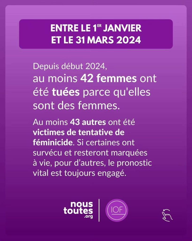 Féminicides – 51 feminicides en France du 1er janvier 2024 au 5 mai 2024, selon IOF.