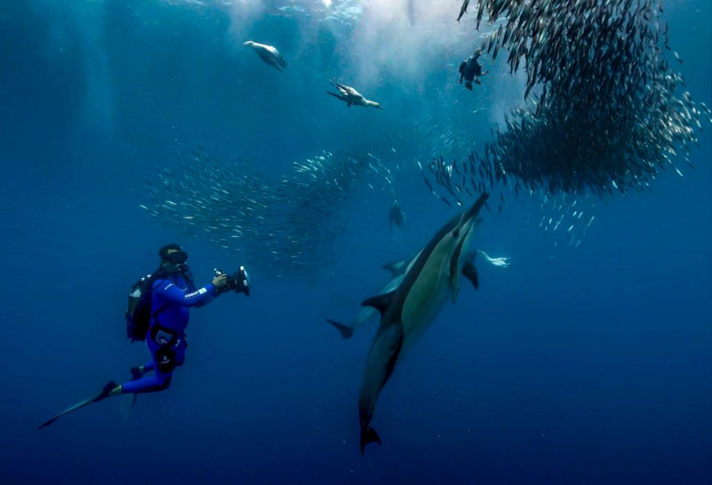 Une expédition au large de la côte sauvage d’Afrique du Sud, où lors d’un rendez-vous annuel, un appel puissant de survie rassemble dans une cohérence parfaite, un ballet à la coordination symbolisant l’équilibre, des dizaines de milliers de dauphins, requins, rorquals de Bryde, fous du Cap, arrivant instantanément dans un mouvement de prédation « sans commune mesure » en pénétrant dans le couloir migratoire où des milliers de sardines forment un essaim gigantesque ondulant dans cet espace se créant à l’arrivée de l’hiver austral, où les courants océaniques induits par le climat le forme.