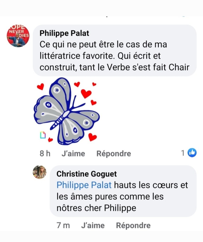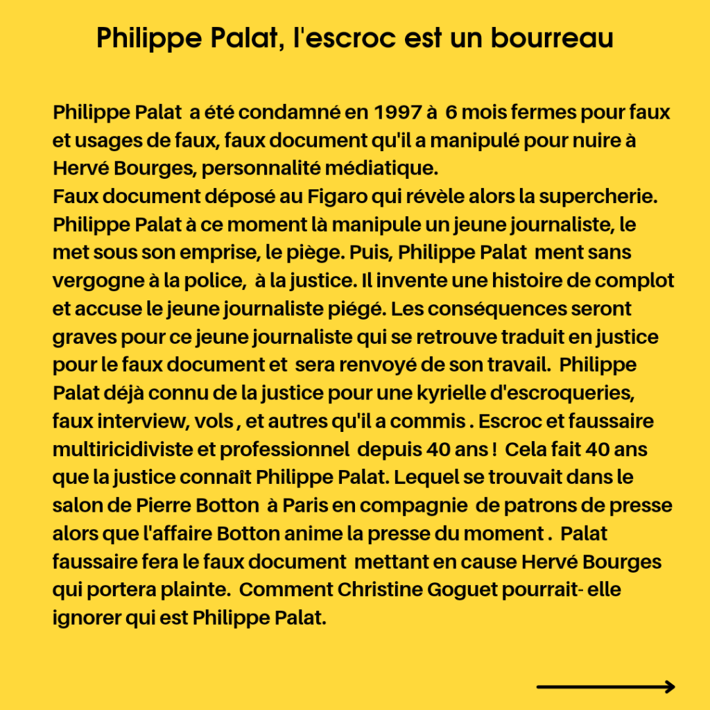 Pour Christine Goguet flattant son égo, Philippe Palat barbouze et voyou, et elle a été avertie concernant une plainte pour les violences conjugales et sexuelles qu’une femme a subi, est selon elle, une « âme pure » à sa ressemblance. Tout est dit ! Humilier une femme en flattant le prédateur qui l’a martyrisée enceinte, la souffrance qu’elle a provoqué et l’impunité de ces milieux formant la société complice, la culture du viol à la française, caractérisent ce que des femmes et des filles ont subi et notamment dans les milieux médiatiques, politiques et du show-business.