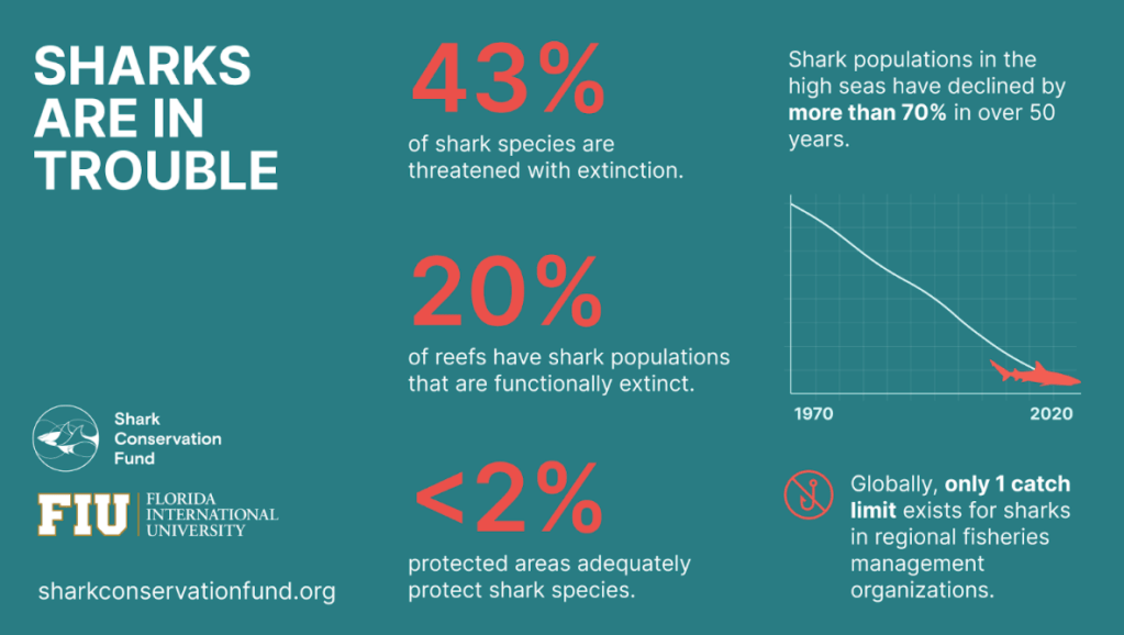 La population des requins des espèces océaniques a chuté de 71 % en 50 ans, et celle des cinq principales espèces de requins de récif a diminué de 63 %. Un constat tragique, la chute du monde vivant, « cela signifie que nous devons reconstituer les populations fortement décimées et gérer la dynamique des requins dans un océan qui évolue en raison des activités humaines et du changement climatique », exprime Mike Heithaus.