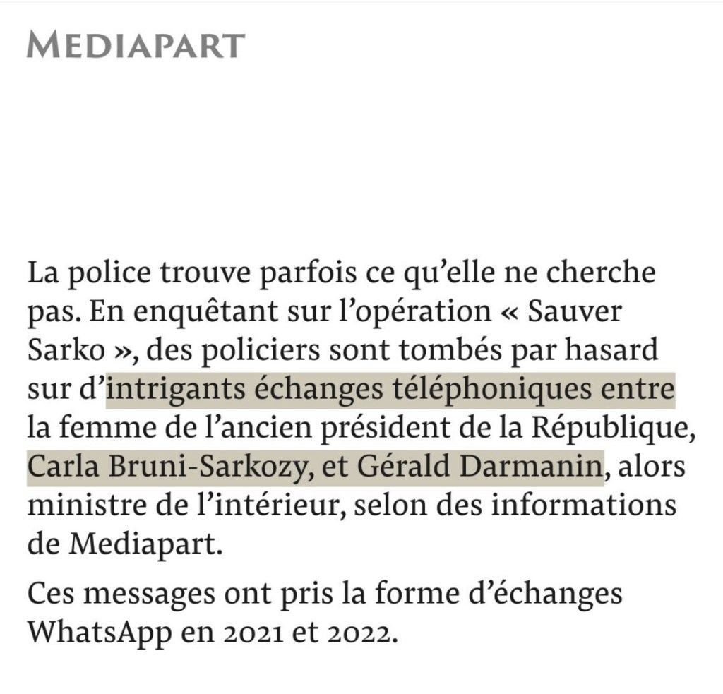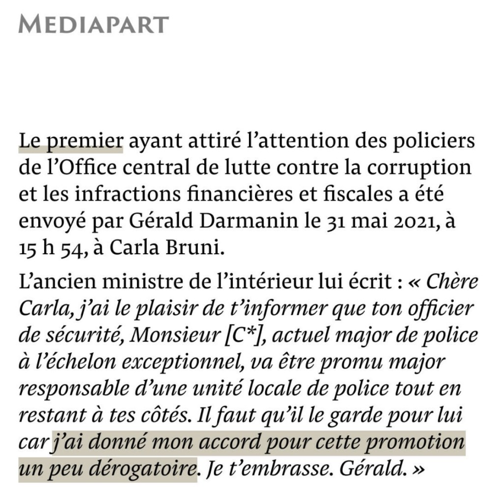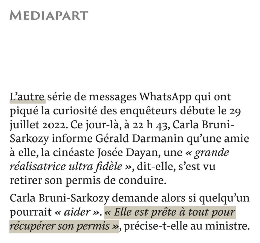 Carla Bruni, conjointe d’un ancien président de la République, écrit à Gérald Darmanin, ministre, qu’une femme du monde culturel et du show-business, très fidèle à leur cause, est « prête à tout » pour récupérer son permis de conduire. Leur cause qui n’est pas celle du peuple. Leur cause qui détruit la démocratie. Leur cause qui n’est pas celle du bien commun.