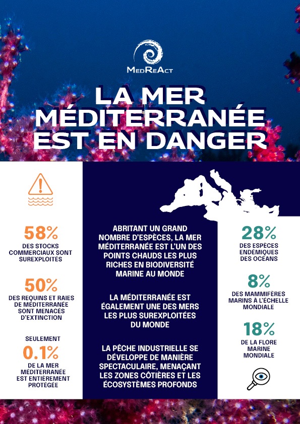 Une autre donnée : 58 % des stocks de poissons évalués sont surpêchés, alerte MedReAct, qui agit pour la préservation de la biodiversité marine et lutte contre la surpêche qui épuise la mer Méditerranée et provoque la mise en péril des stocks de poissons.
