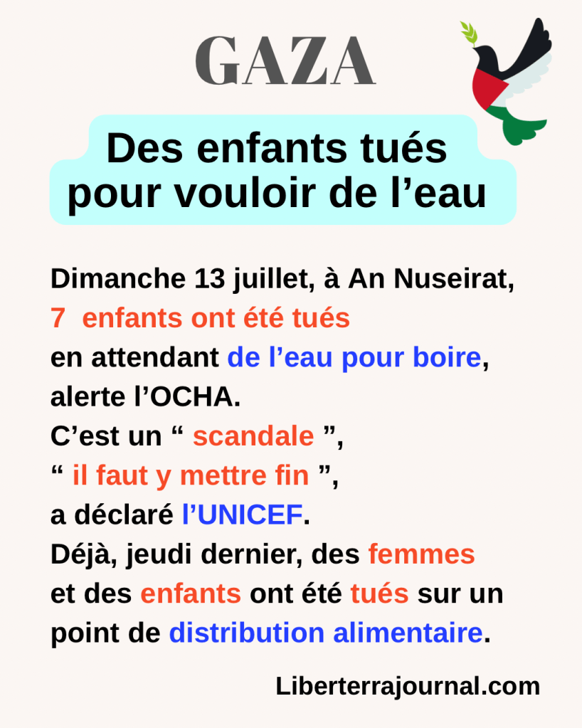 Dimanche 13 juillet, sept enfants ont été tués, à An Nuseirat, en attendant de l’eau pour boire. Jeudi dernier, neuf enfants et des femmes ont été tués en attendant des vivres. Les points de distribution de fournitures nutritionnelles sont devenus des pièges mortels pour les civils.