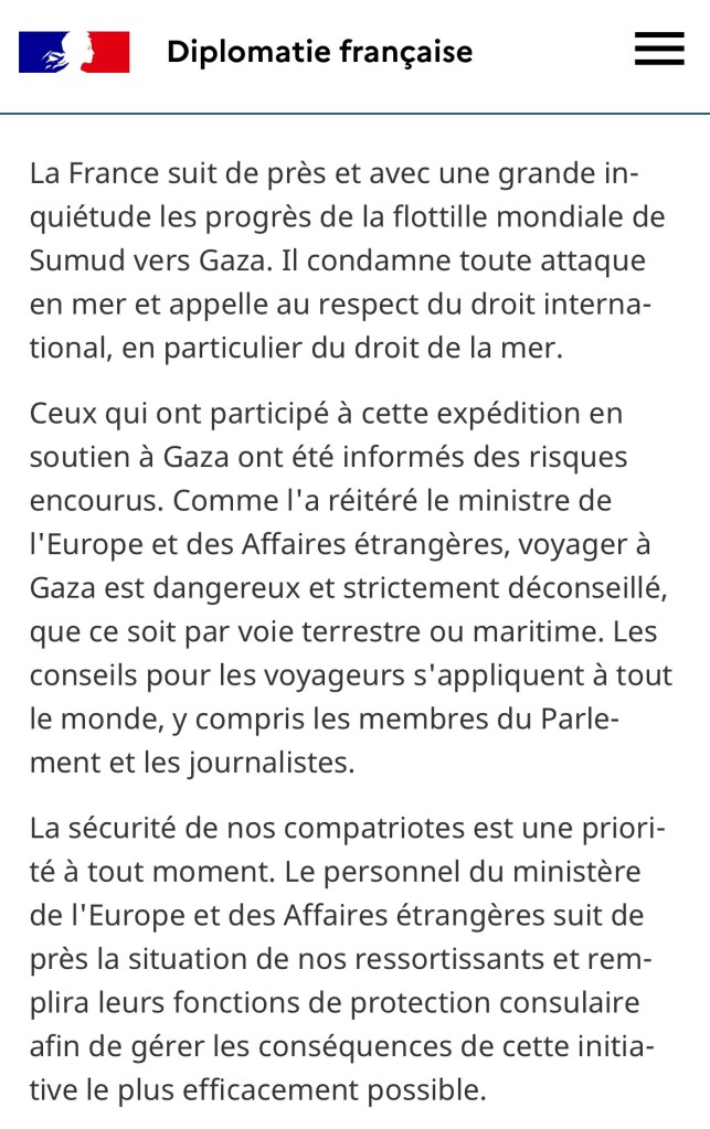 Le gouvernement français, tout en suivant la flottille de près et en exprimant officiellement sa « préoccupation », se réfère dans son communiqué aux participants comme de simples « voyageurs », minimisant ainsi l’engagement humanitaire et courageux de ces hommes et femmes venus de tous horizons pour protéger la vie des enfants et des populations civiles de Gaza. Ce terme édulcore la mission, alors qu’elle incarne un acte de solidarité et de résistance face à des conditions maritimes et militaires extrêmement dangereuses.