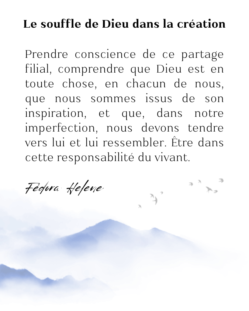 Prendre conscience de ce partage filial, comprendre que Dieu est en toute chose, en chacun de nous, que nous sommes issus de son inspiration, et que, dans notre imperfection, nous devons tendre vers lui et lui ressembler. Être dans cette responsabilité du vivant.