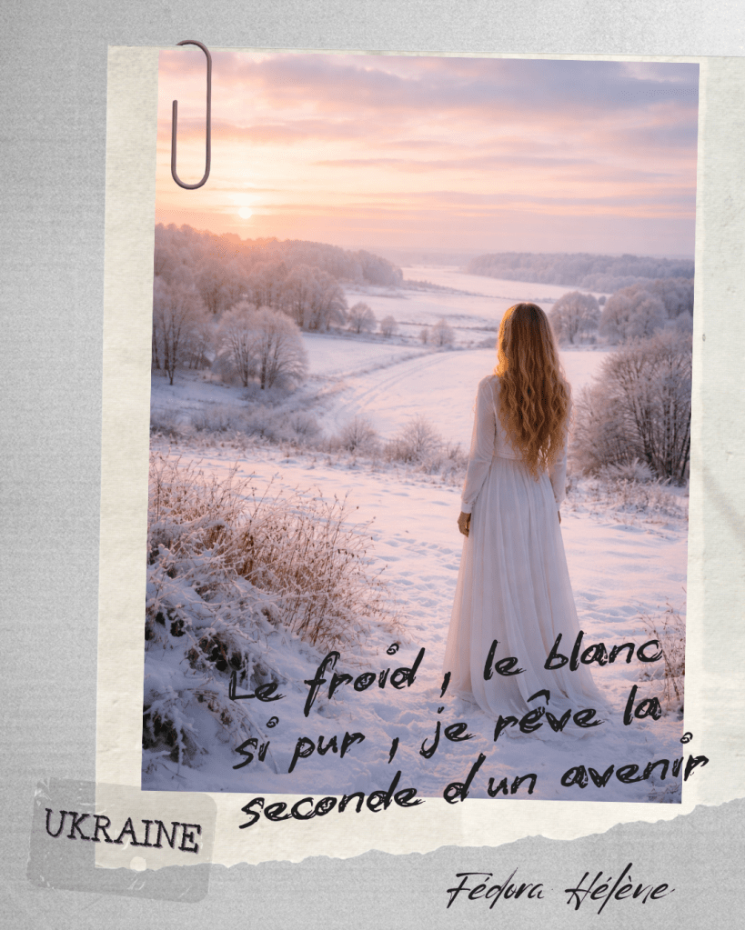 Je laisse mon corps vivre, mes cheveux ondulés, la poudre blanche s’envole, et tournoie le temps. Le long voyage, je traverse les siècles, les champs immuables, les arbres majestueux aux mille ans, l’âge n’est plus que nôtre, l’éphémère passage. J’étais enfant et aujourd’hui, les pétales gelés retiennent les années. Le souffle de la paix emplit l’air de ma respiration. Immobile, seule, mes yeux pensent. J’enfouis mes mains dans la neige. Un corps à corps, échapper soudain à la douleur, la liberté parcourt mes veines. Les hommes ne sont plus. Plus un bruit au loin, ni demain. Je pourrais laisser couler quelques notes, et voir le sel et la chaleur faire renaître le printemps. Une goutte, le petit ruisseau déshabille la fleur de glace vêtue. La vie appartient aux rêves, la fleur de cristal orne ma main. La pierre précieuse brille au soleil levant. Un sourire, mon visage s’illumine, mes lèvres prononcent l’amour. Et s’éteint toujours le ravissant au rouge perçant la blancheur de mon teint. Une balle, la guerre venue troubler le vent froid se glissant contre moi.