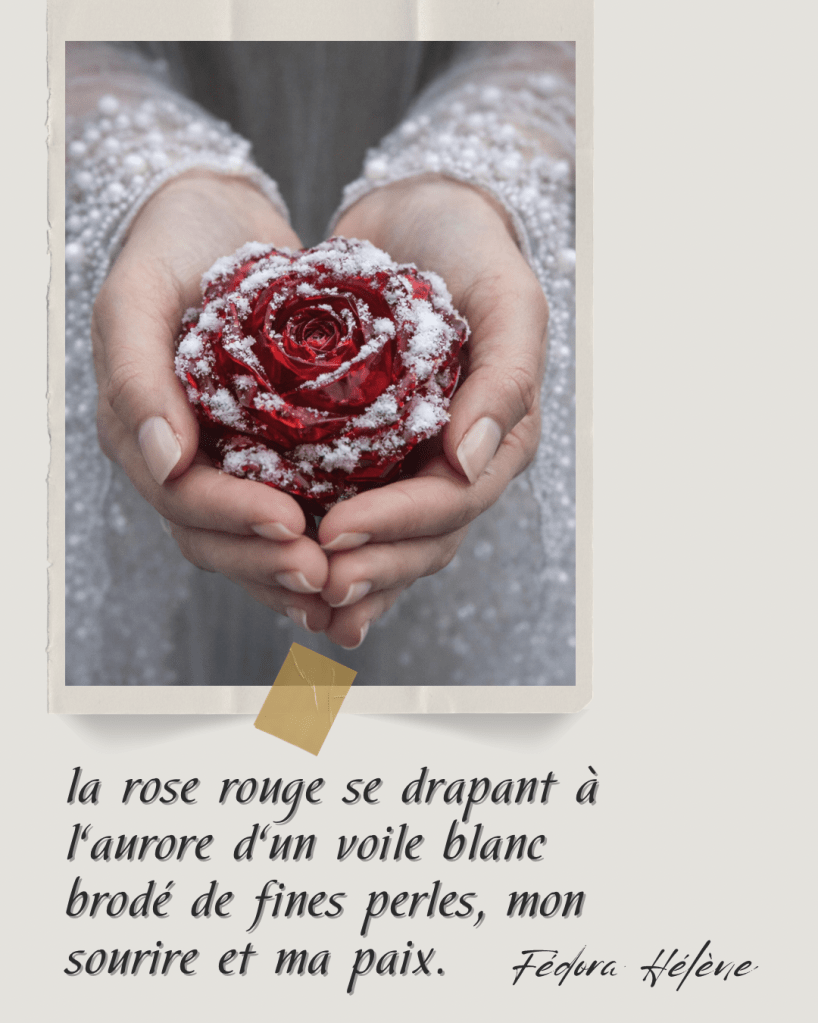 Liberté s’inscrit quand chaque année sur la terre gelée apparaît la rose rouge se drapant à l’aurore d’un voile blanc brodé de fines perles, mon sourire et ma paix. Il vient jouer l’ami, un violon l’enveloppe, le son vibre et l’onde. La mémoire et le petit ruisseau. D’autres pas marquent le sol. Mon ami, mon amour, je ferme les yeux dans tes bras. Ma robe blanche en voile du bateau à l’ivresse des songes, ta tristesse en eau sur mon visage, il naît de nouveau le chemin, où tu sèmes dans le fin sillon de tes larmes mon corps vivant et mon cœur battant, légère, je pars. L’adieu en présent de paix, en promesse d’éternité, mon rire que tu entends, quelles notes de vie.