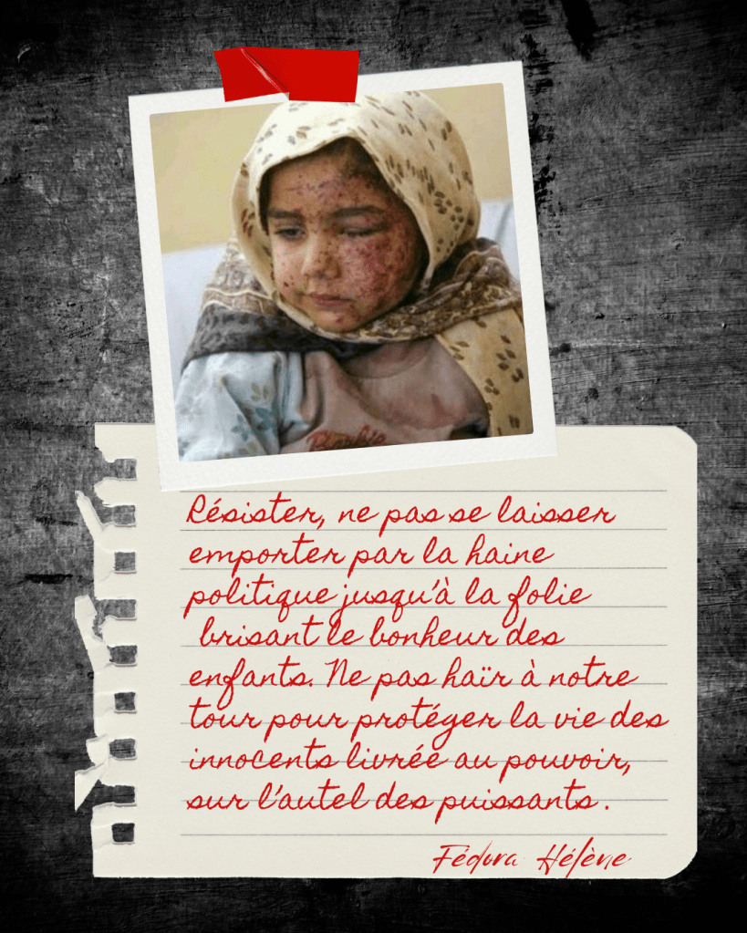 Aujourd’hui, un enfant de Palestine s’est endormi à jamais. Un éclat d’obus dans le cœur. Prier en douleur pour avoir la force de poursuivre le chemin en douceur, sans croire que l’homme est cet ennemi redoutable dévastant le plus précieux. Les cités riches, déjà au désert avant la fin du jour.