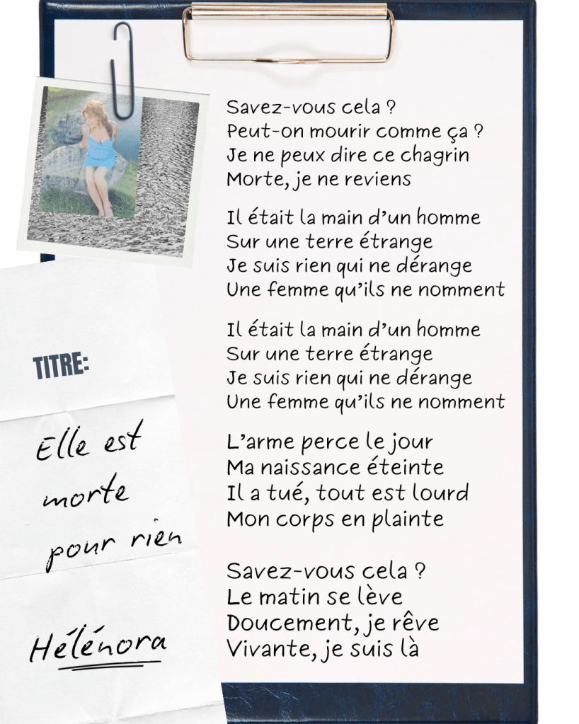 « Hélénora » n’est pas qu’un poème, c’est une pièce à conviction, un témoignage, une mémoire. Celle d’une vie fauchée « pour rien », sous la main de celui qui aurait dû protéger.