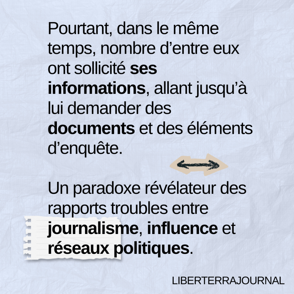 Les haines et rivalités rédactionnelles, les mensonges internes, les hypocrisies et manipulations, les faux amis, la note du ministère de l’Intérieur distillée en enquête d’investigation bidon, ou en simple information sortie de nulle part. Ce sont aussi les fortes pressions que subissent certains journalistes contraints de suivre l’objectif de réseaux au pouvoir.