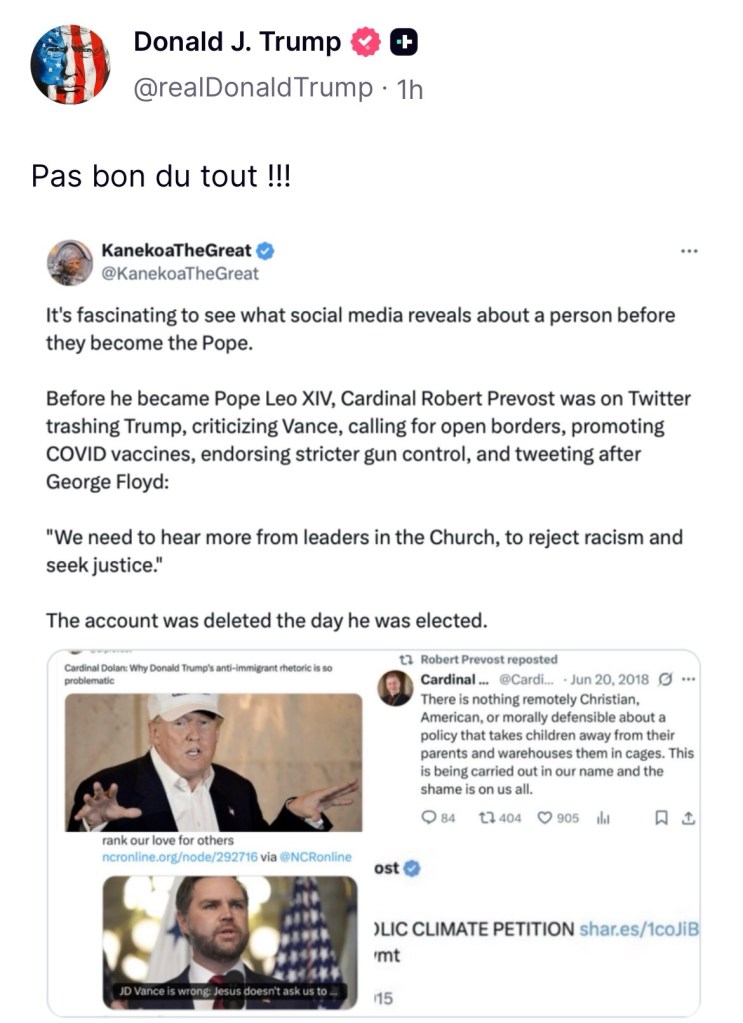Alors que les tensions géopolitiques s’intensifient, une nouvelle onde de choc secoue la sphère numérique : Donald Trump s’en est pris violemment ce jour au Pape Léon XIV, qualifiant ses prises de position de « pas bon du tout !!! ».